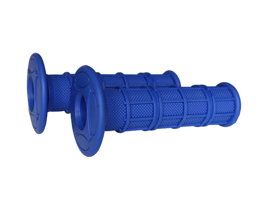 Siniset mopon gripit. Gripit ovat pehmeät, jämäkät ja hyvän tuntuiset kädessä sekä kestävät.